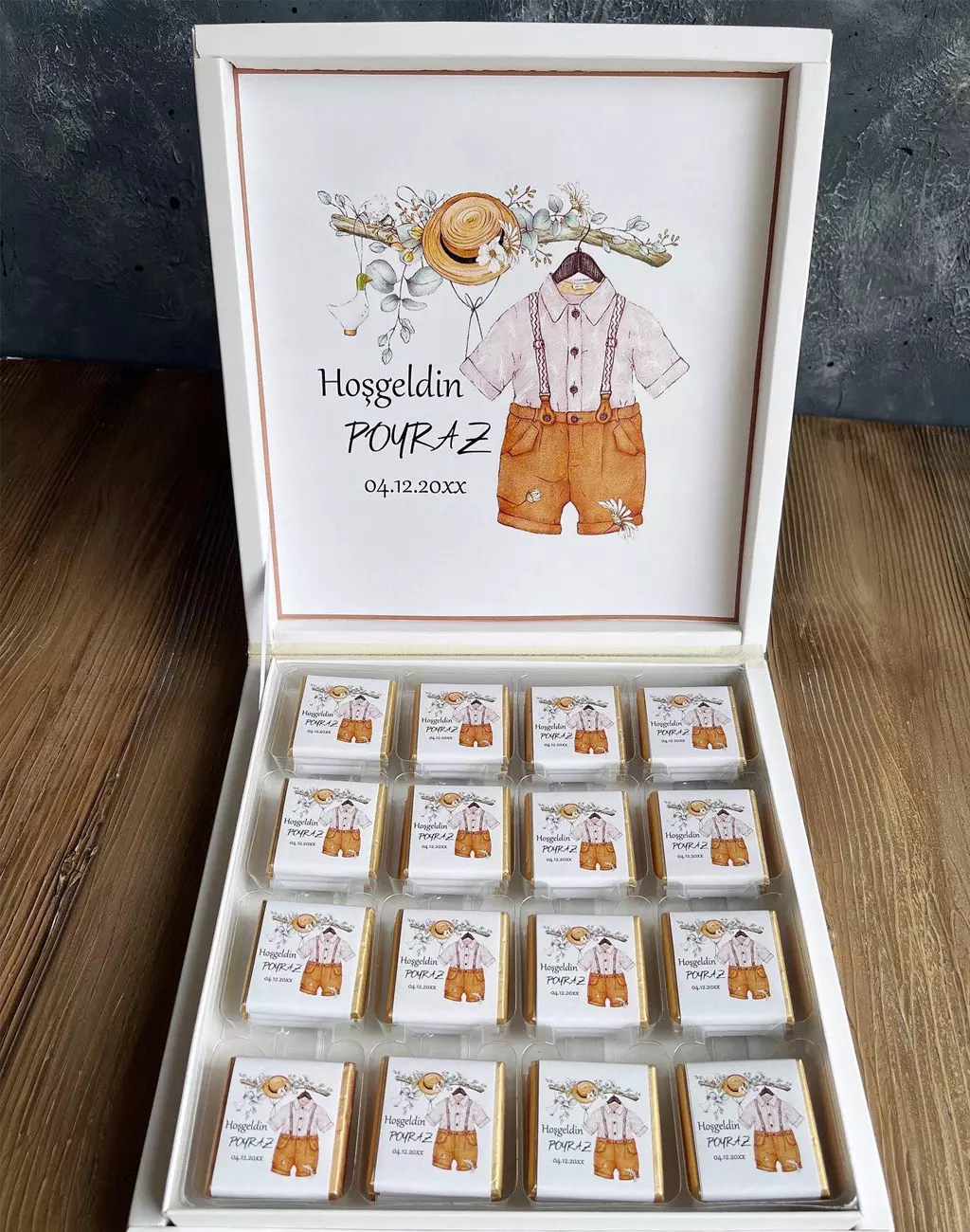 Bebek merasimleri için özel tasarım salopet figürlü çikolatalar.